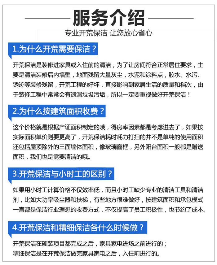 西安駿潔保潔服務管理有限公司實行24小時服務,同時,我們的服務形式靈活多樣,有日保潔等各種定期清潔,也可依照您的特別要求,以合理的價格,提供細致周到的服務,并且大限度地滿足您的特別要求。